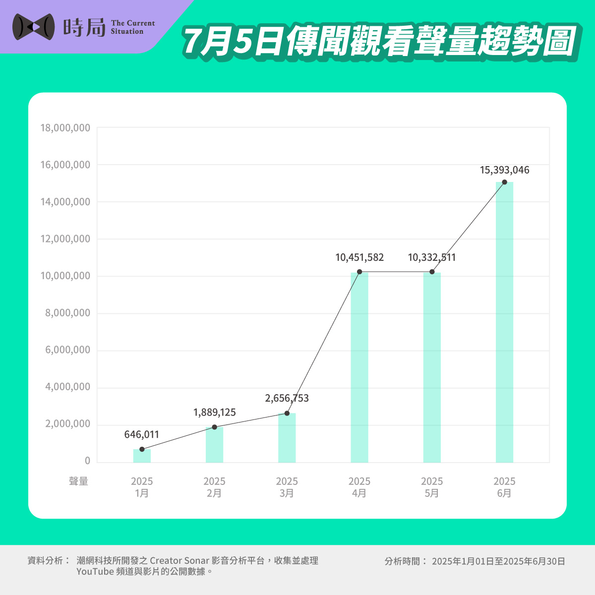 《時局 The Current Situation》根據潮網科技 Creator Sonar 影音分析平台數據,發現「 7月5日末日預言」在 2025 年初原本僅是小眾討論。1 月相關 YouTube 影片僅 64 萬次觀看,但到 6月時,單月觀看次數已突破 1,530 萬,半年內總體聲量暴增超過 23 倍,形成明確的上升趨勢曲線。