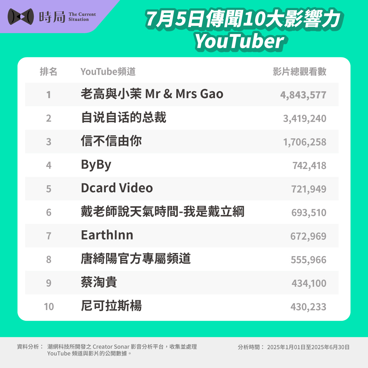 本文所調查的結果由《時局 The Current Situation》平台提供,資料來源基於潮網科技Creator Sonar影音分析平台。本次分析涵蓋的時間範圍為2025年1月1日至2025年6月30日。Creator Sonar平台主要收集並處理YouTube頻道與影片的公開數據,並利用生成式AI技術,針對影片內容進行語音轉文字後,進行語意內容分析。本次排行並非根據投票或民調結果,而是單純根據影片的觀看次數及其熱度進行排序,結果不代表正負評價。