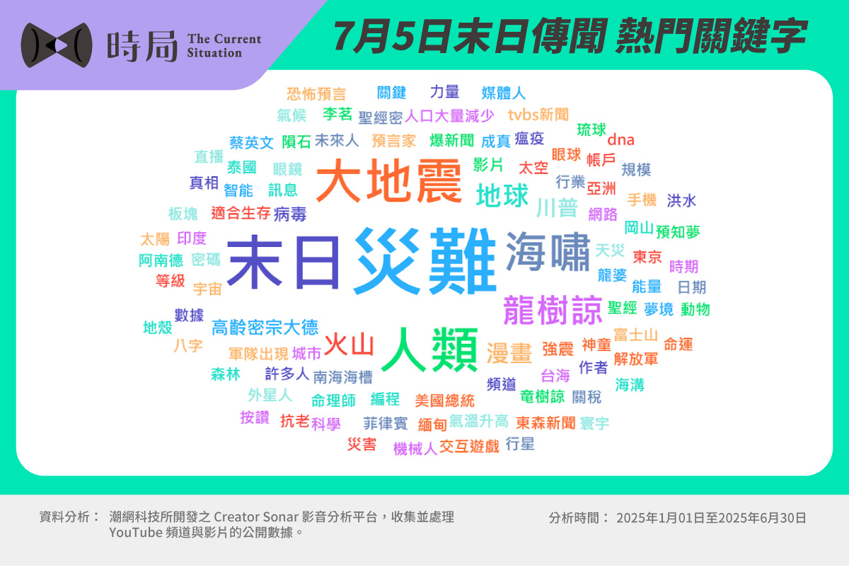 《時局 The Current Situation》網路聲量觀察站將從影音流量數據出發,帶你看懂這場「 7 月 5 日預言」說,如何在短短半年內累積超過四千萬觀看次數,了解 2025 年上半年最具擴散力的現象級話題。