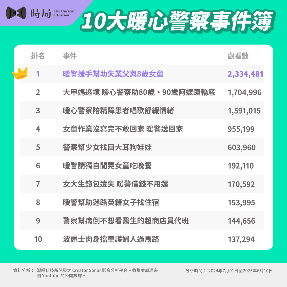 警察不只是執法者,有時更是我們生活中溫柔的守護者,《時局 The Current Situation》網路聲量觀察站,在 6/15 警察節這天,將帶你一起回顧過去一年 10 則最讓網友感動的暖警行動。